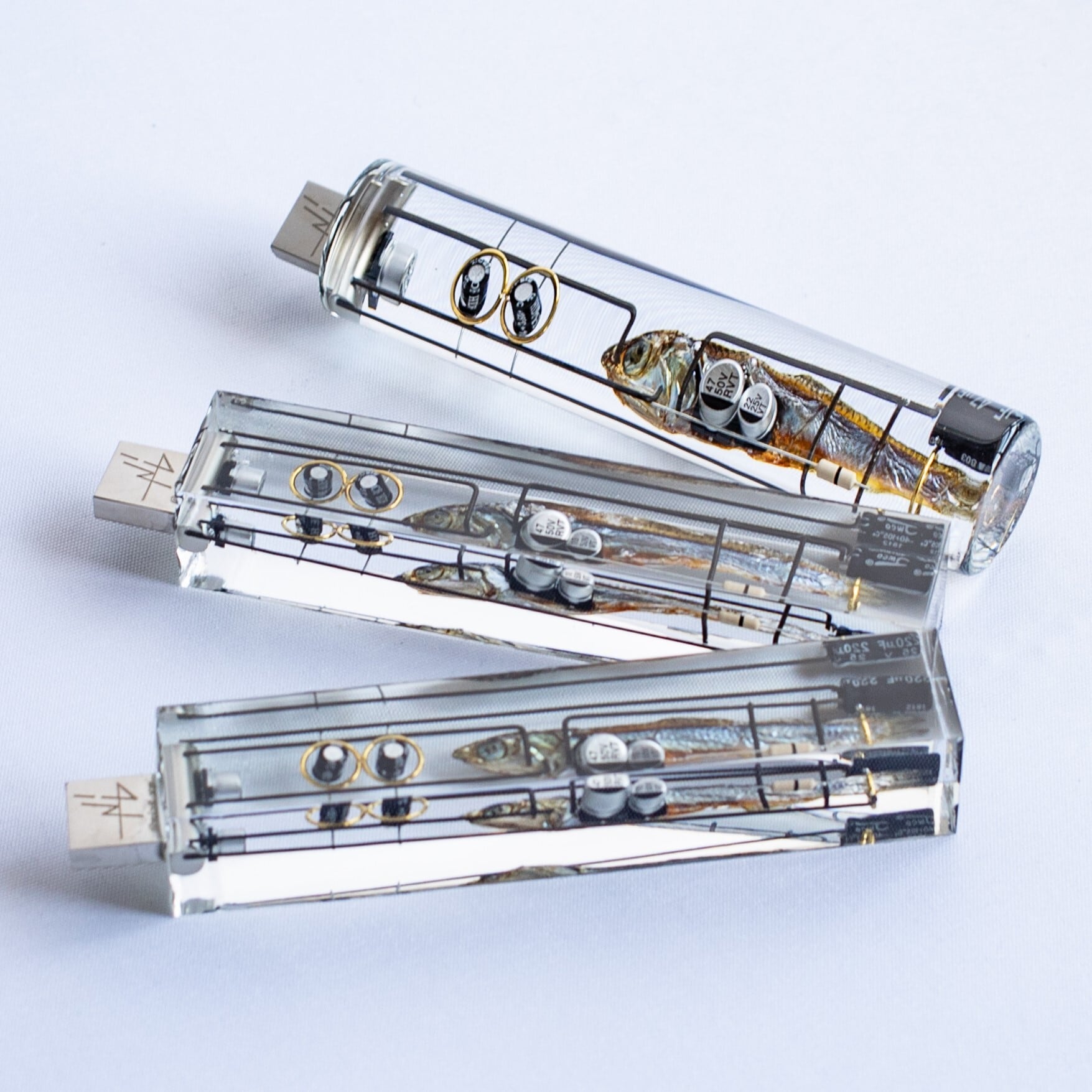現在、生物の脳とコンピュータを直接接続する「ブレイン・コンピュータ・インターフェース(Brain Computer Interface, BCI)」の技術が盛んに研究されていますが、現代の科学技術をもってしても今だに不可能な、「コンピュータと生体の脳の間でデータを直接入出力する」という超未来の技術コンセプトをリムーバブルディスクの形で表現した、小魚の脳に情報を記憶させる(ように見える)USBメモリです。