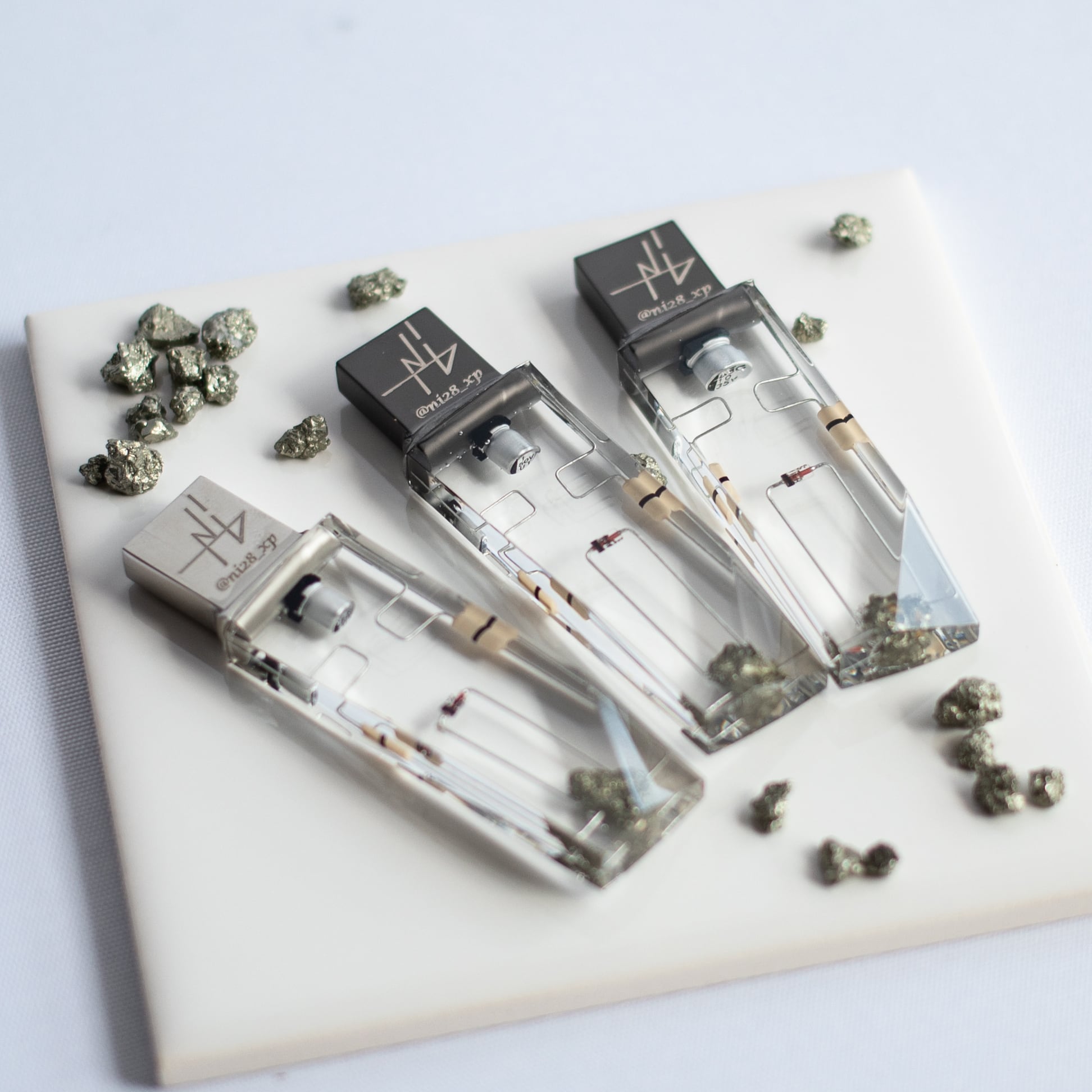 魚の頭脳に情報を記憶させる「生体メモリhttps://nickelxp.handcrafted.jp/items/92791024 」の原点となったオーパーツ風USBメモリにあたります。内部の「鉱石」には鈍色に輝く金属光沢をもつ黄鉄鉱(パイライト)の欠片を採用しており、そのキラキラとした輝きはいかにも謎の記憶媒体といった雰囲気を醸し出しています。