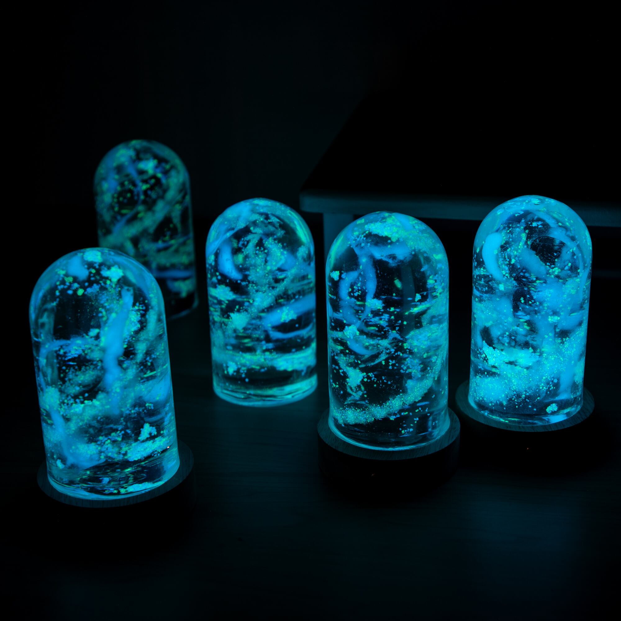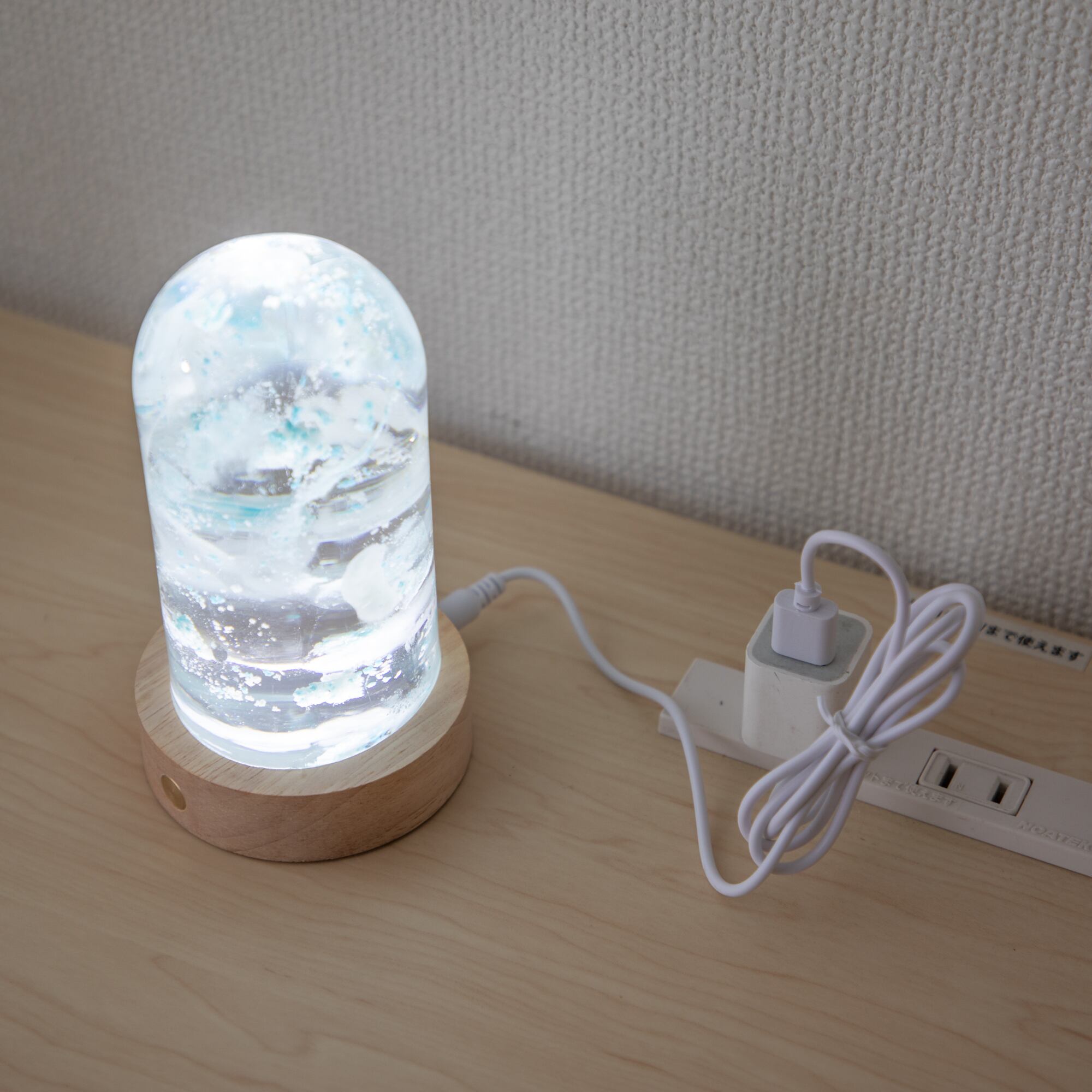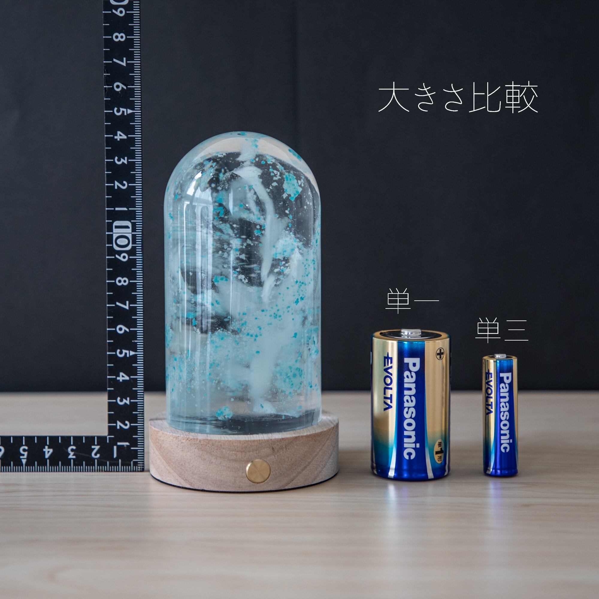 透明度の極めて高いレジンに星屑を封入しているため、日中はガラスのように涼しげで透明感のある立体アートとして鑑賞でき、夜の間はLED台座で照らしてテーブルランプに、さらに明かりを消すと今度は蓄光で光る星空を楽しむことができ、1日中違った表情で生活を彩ってくれます。