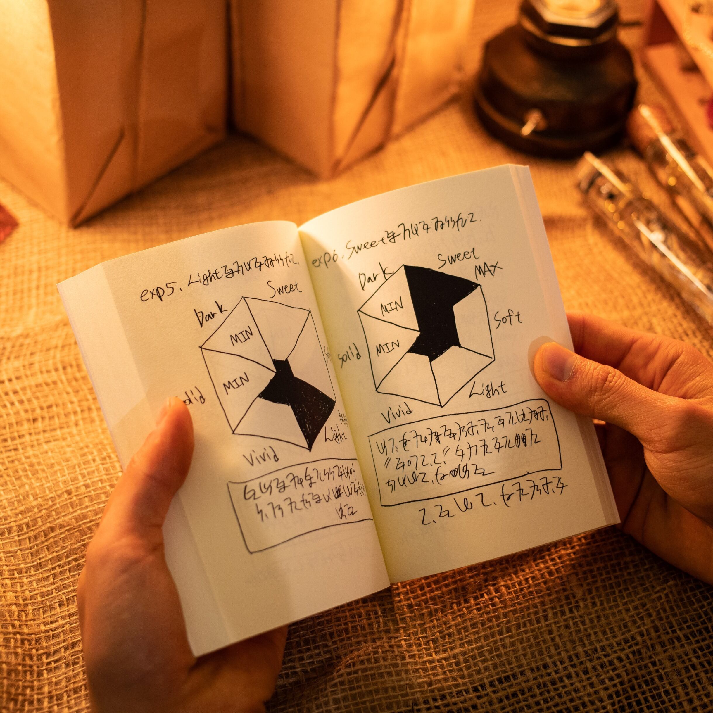 そこで、200ページにも及ぶ膨大な架空言語の文章を効率よく書くため、パソコン上でニケル文字のフォントを作成しました。さらに手描きの文章をパソコンに取り込んで製本するまでのフローも新しく作りました。