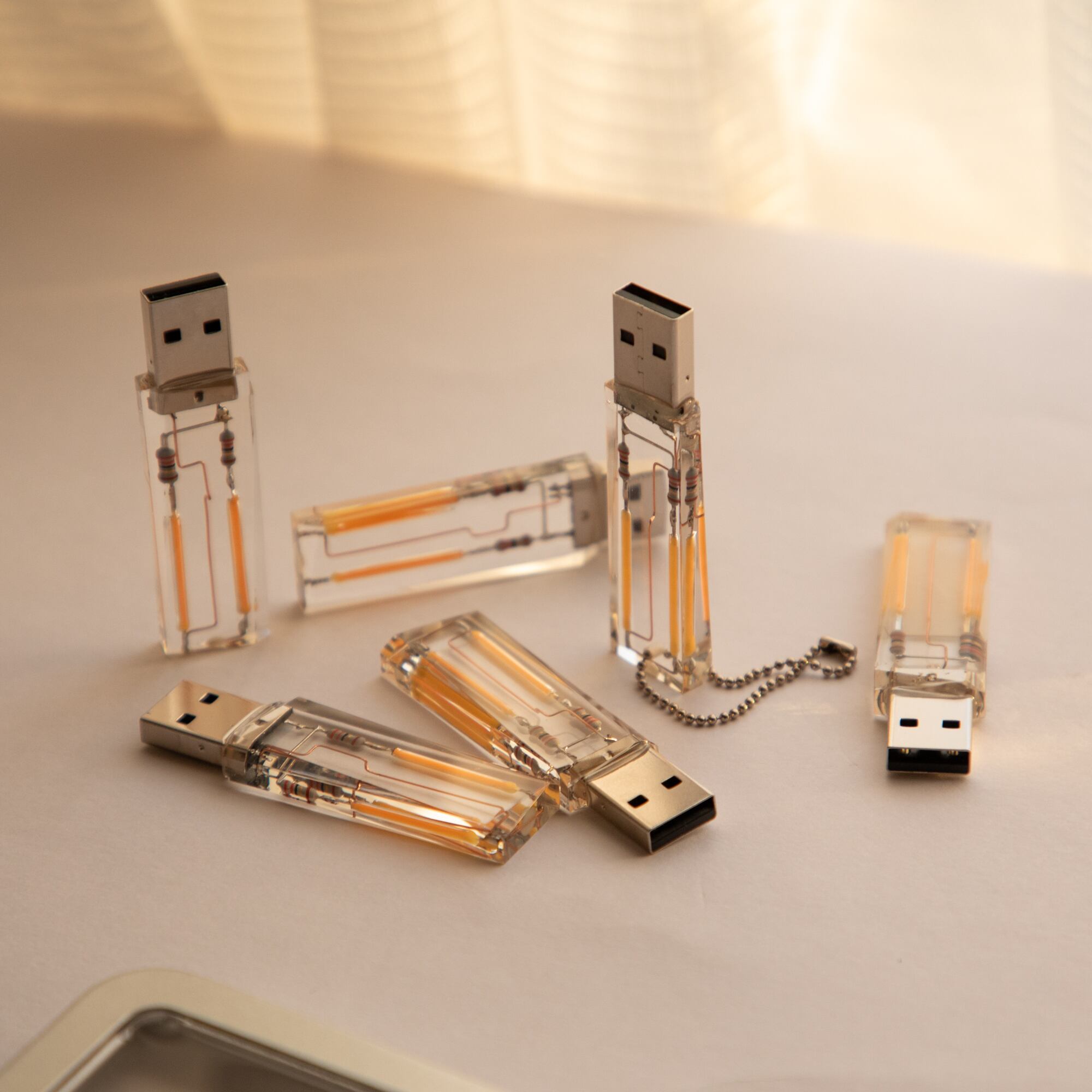 前作のUSBキャンドルでは、ろうそくをイメージした白いレジンにフィラメントを1本配線することで、「USB電源で使えるキャンドル」というコンセプトの作品になっていましたが、本作ではデザインコンセプトを少し変更し、光源の並列接続によって複雑化した空中配線がより見えやすいように全体をクリアなレジンで製作しました。